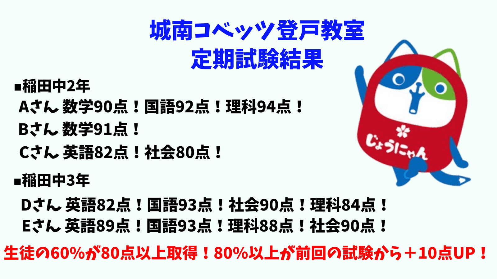 サポートが厚く、毎回お迎えとお見送りをしてくださります。定期テスト前には講習をやってくださりとても助かっています