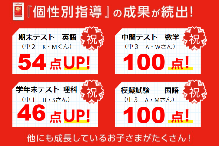 通っている学校に合わせたテスト対策ができるから内申点アップにつながります。テスト後には、弱点を分析し克服するための指導をするので、受験にも対応できる学力が身につきます。