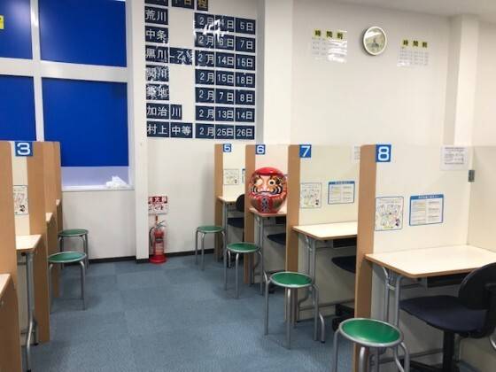 教室が狭い感じがしますが、間仕切りで仕切られているのでいいと思う。ただ、入り口から席が近いのが気になります。