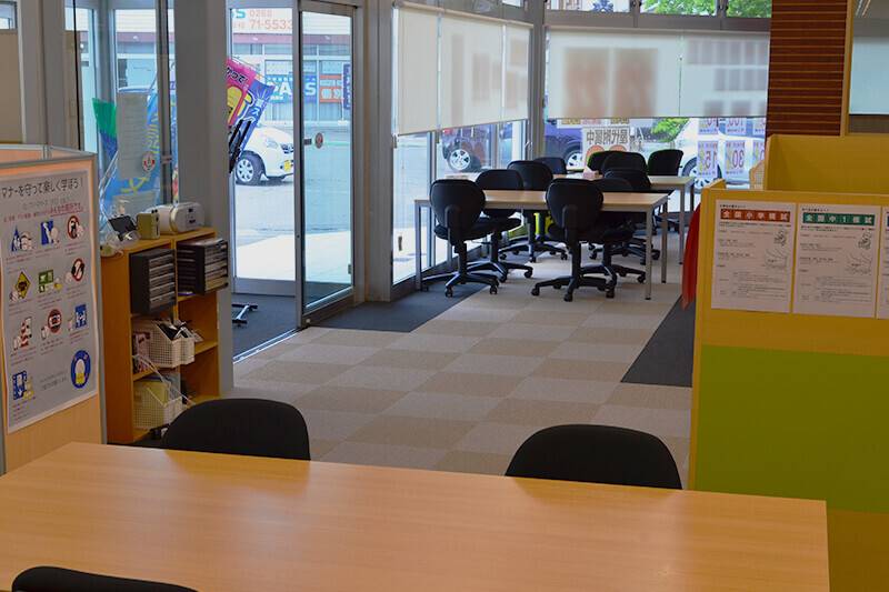 小さい教室ですが上手に区切られており学習に問題ない空間だと思います。入り口入ってすぐ教室なのでドアの開閉の多い時など入り口付近の子は寒くならないかなと考えます