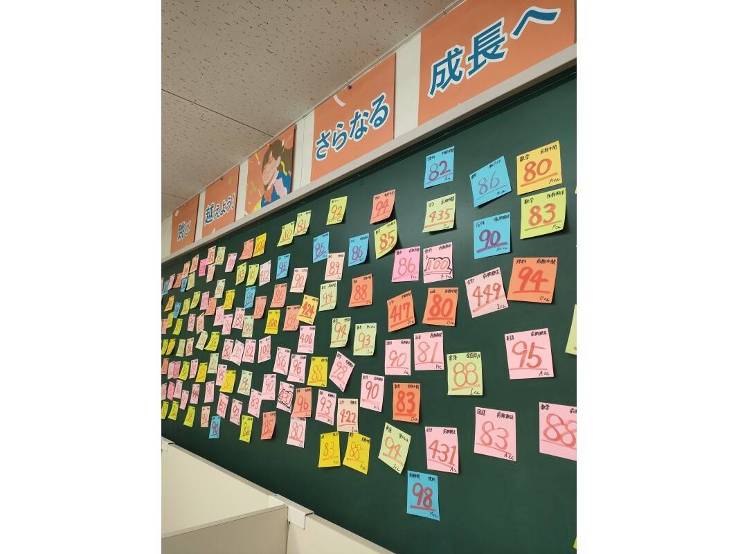 講師のデスクがある空間も壁とかはなく開かれているため生徒が声をかけやすい。高校合格を盛り上げる掲示も工夫されていて素晴らしいと思う。