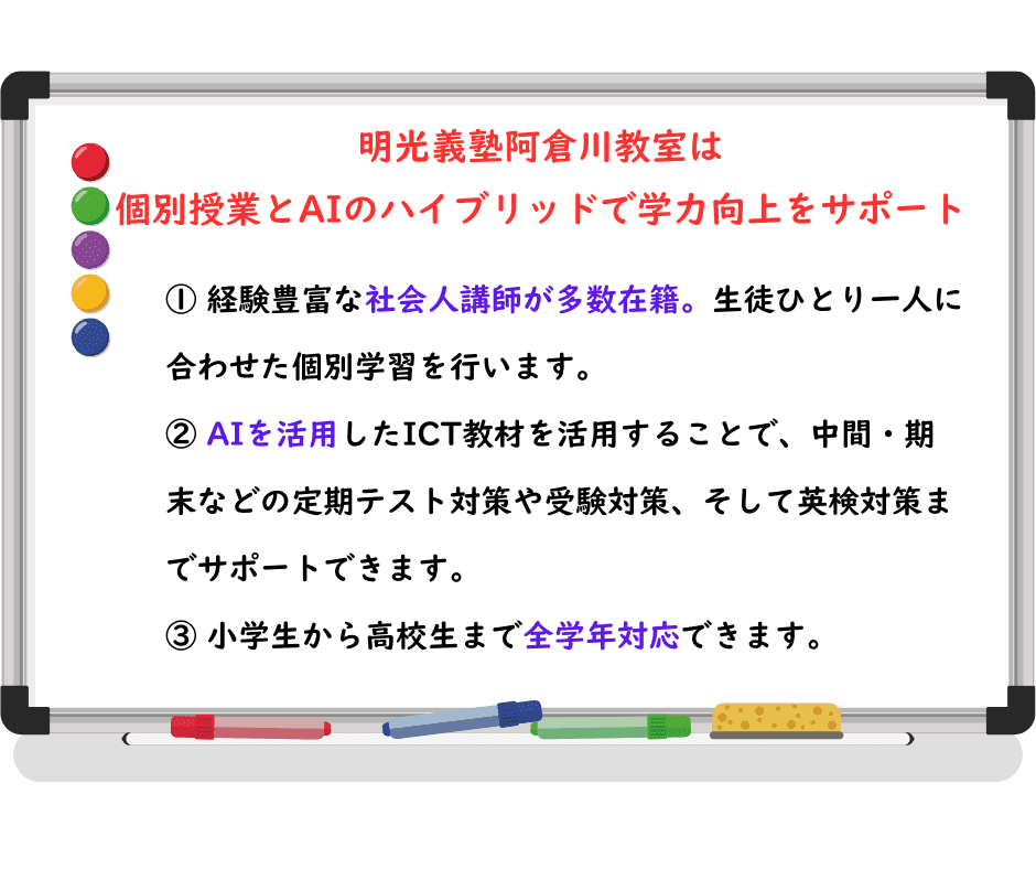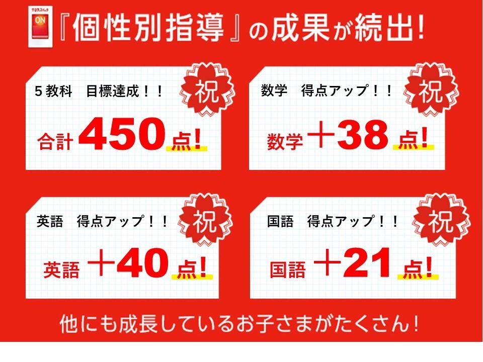 通っている学校に合わせたテスト対策ができるから内申点アップにつながります。テスト後には、弱点を分析し克服するための指導をするので、受験にも対応できる学力が身につきます。