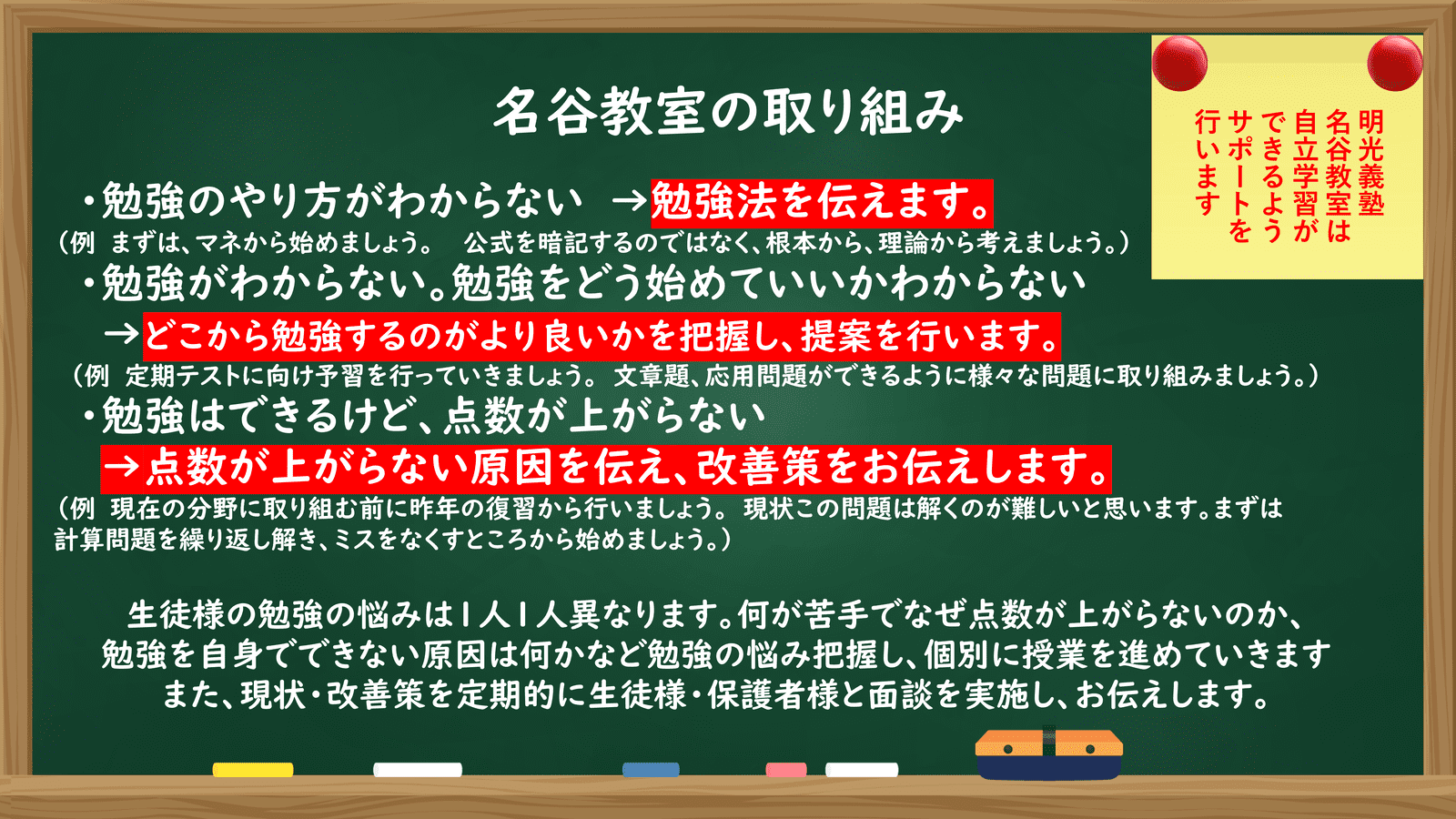 個別であるため集団塾と比較して少し高めの設定であることは理解しております。 あとはとくにありません。