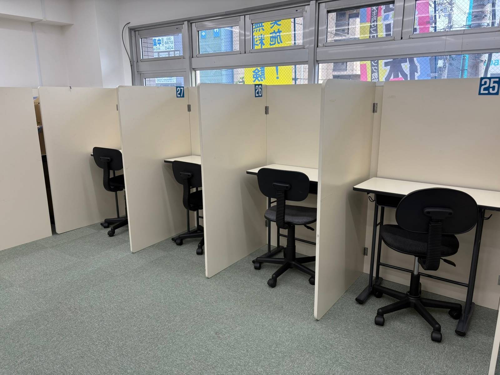 机ごとにパーティションで仕切られており、学習に集中しやすい環境になっていると思う。 先生は常におられ、自習室も解放されているため、通学日以外でも自由に使える