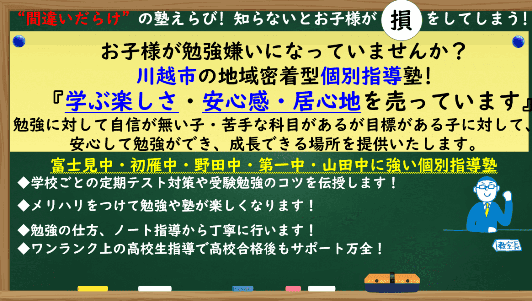子供達が興味が出るよう、面白楽しく授業をしてくれる。おかげで勉強をする事に興味を持ち、塾も楽しく通えている。
