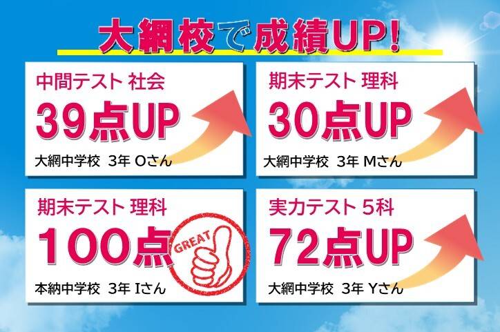 勉強の習慣をつけることができました。私立受験では無事合格し定期テストでは最終的に400点を超えることができました。