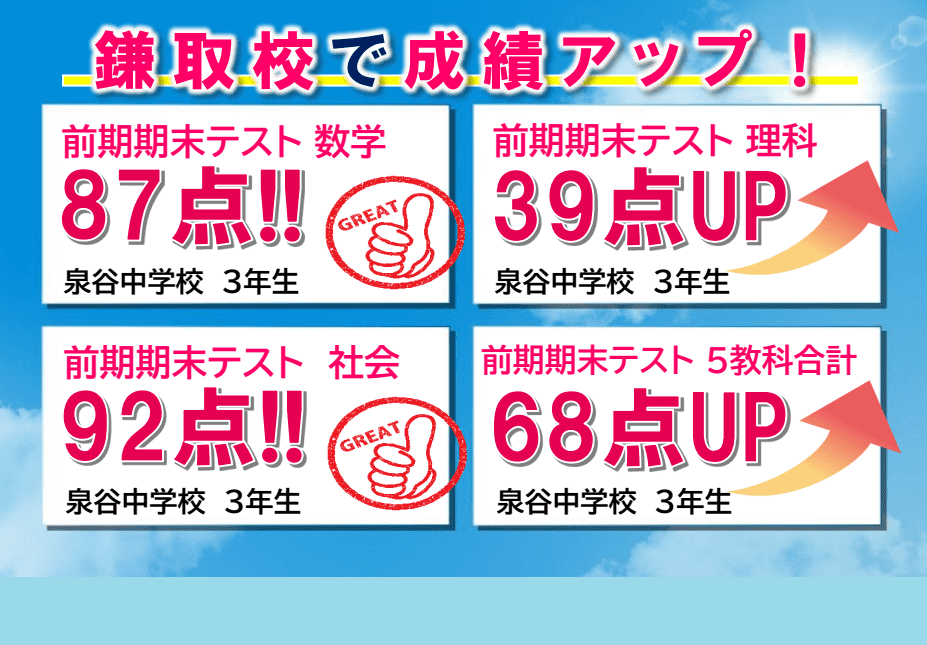 勉強の習慣をつけることができました。私立受験では無事合格し定期テストでは最終的に400点を超えることができました。