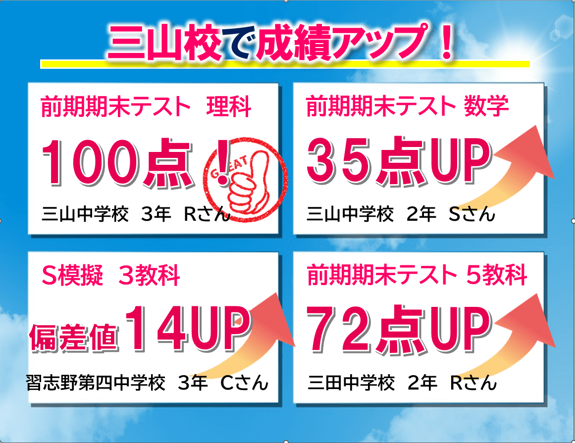 勉強の習慣をつけることができました。私立受験では無事合格し定期テストでは最終的に400点を超えることができました。