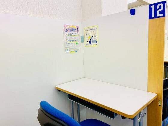 教室は個別にパーティションが施され、明るい照明で集中して学習することができている。
