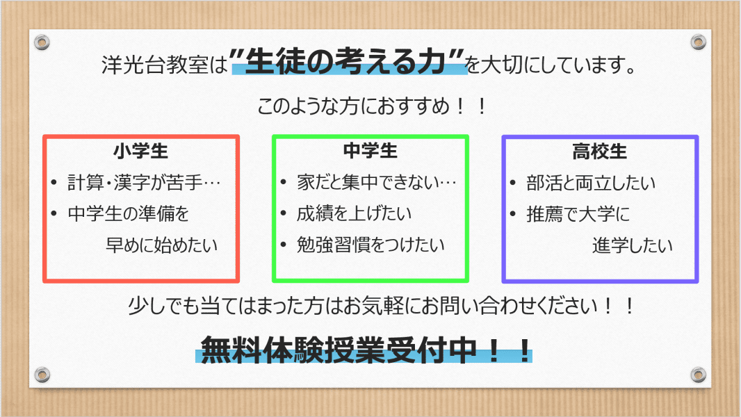 大手予備校や、塾とあまり変わらない値段となりましたが、費用対効果は抜群です。こちらの方が安いようにも思います。