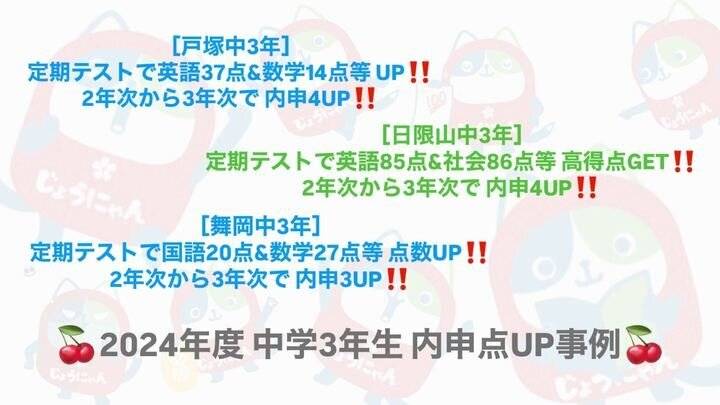 学校での成績が向上している点は評価できる。高校受験に向けて3か月ごとに面談しているが、概ね順調に学習が進んでいる。