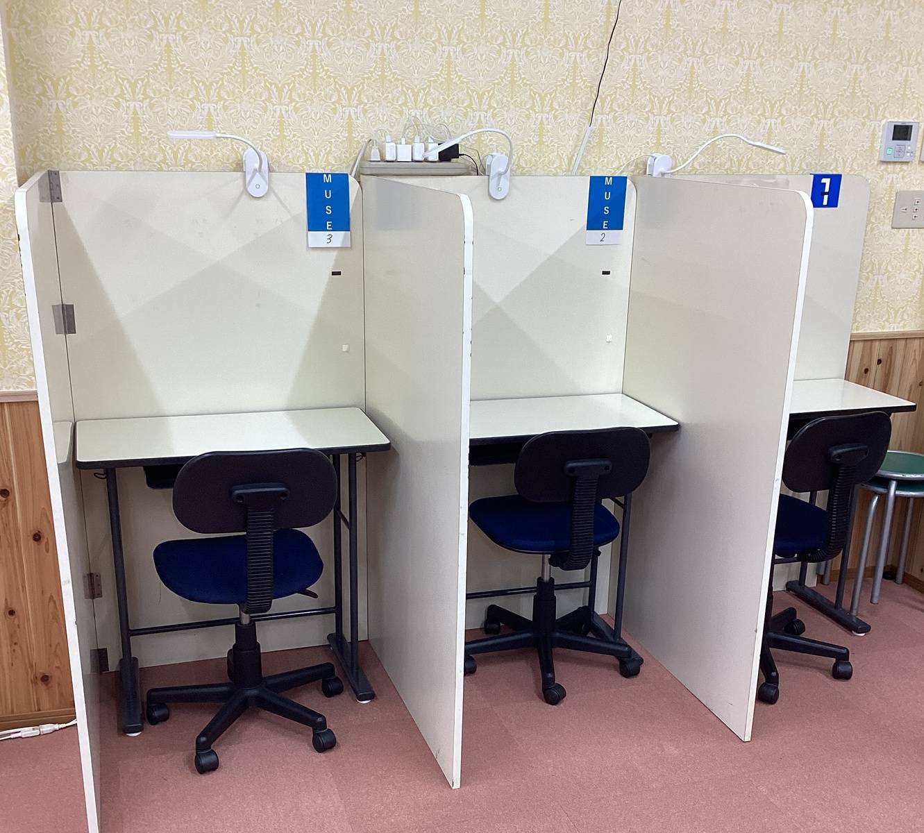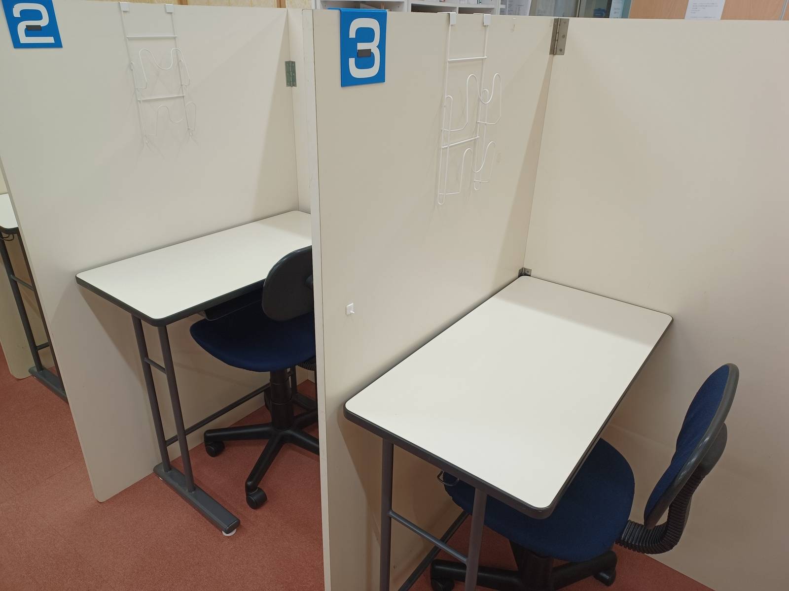 机があるが、横の人が見えないように板が設置されている。なので横の人と話すなどの事が出来ないため集中できる