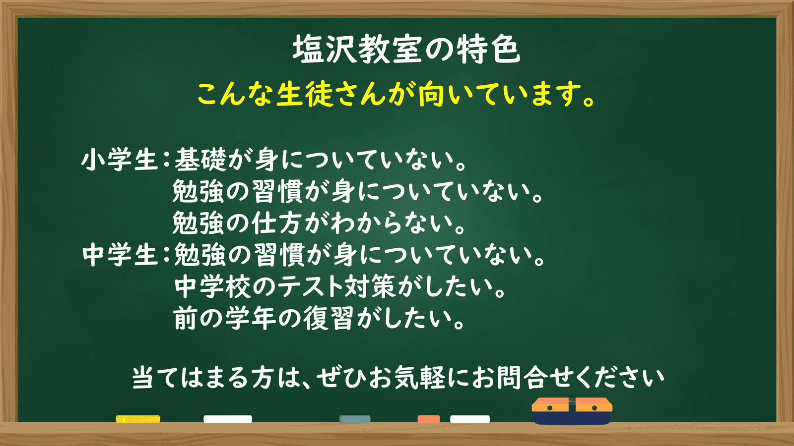 | 授業形式 | 個別指導(1対2~)・オンライン指導・自立学習・映像授業 |