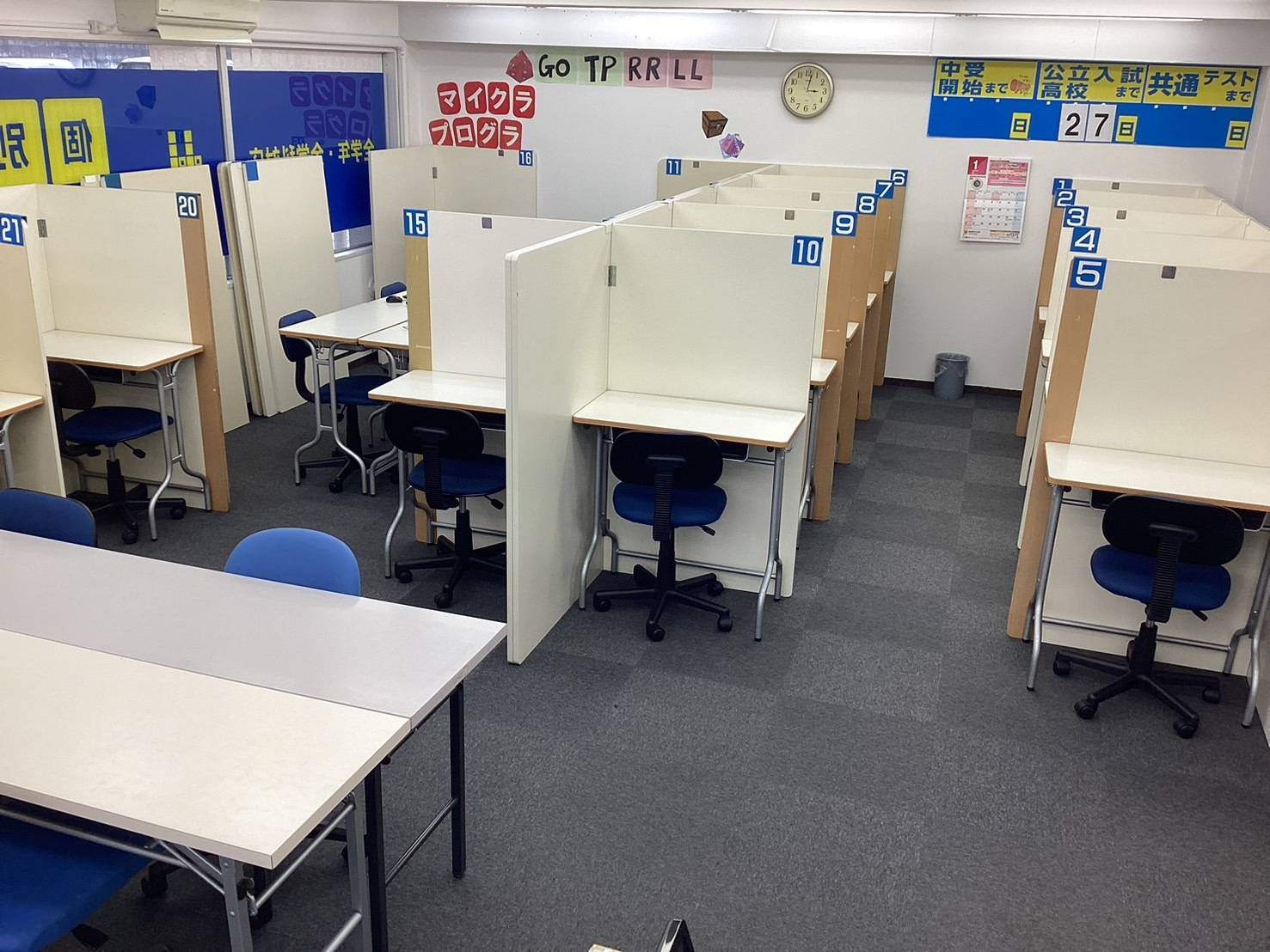 教室も明るくてきれいみたい。机も一つ一つ仕切りがついているので、安心できる。 自習スペースと、指導スペースが別れている。静か過ぎないから子どもはいいみたいです。