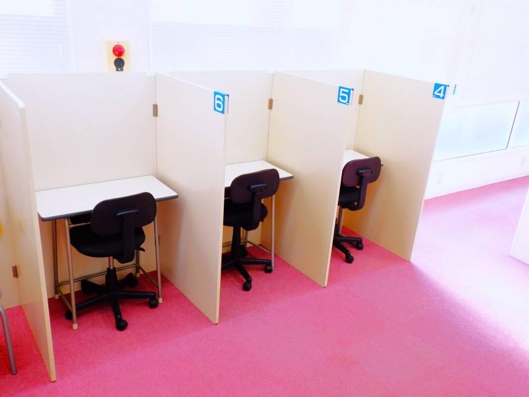 教室の広さは狭いほうに入ると思う。生徒さんがたくさんいすぎて、自習に来ても空いている机がない時期もあったが違うビルの一室を自習室用に借りた