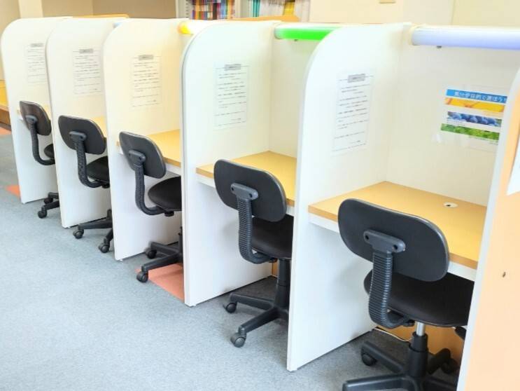 建物の中にあるので、少し狭めだが、安心感がある しっかり自習スペースもある 教材も沢山置いてある