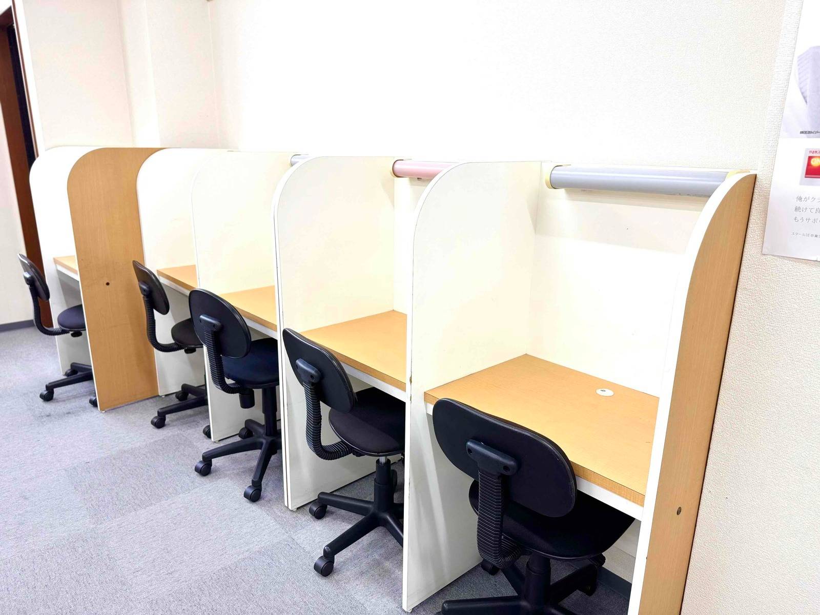 自習室は席数が沢山あり隣の人の顔が見えないようにしっかりとした仕切りがあり安心して勉強することかをできた いつでも質問に答えてくれる環境が整っていたのもよかった