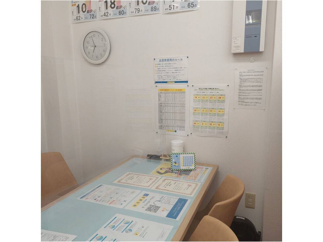 広くはない教室でしたが、机の配置が変わり工夫してくれていました。トイレもきれいでした。コピー機があり、オリジナルの問題を印刷して解くことができました。
