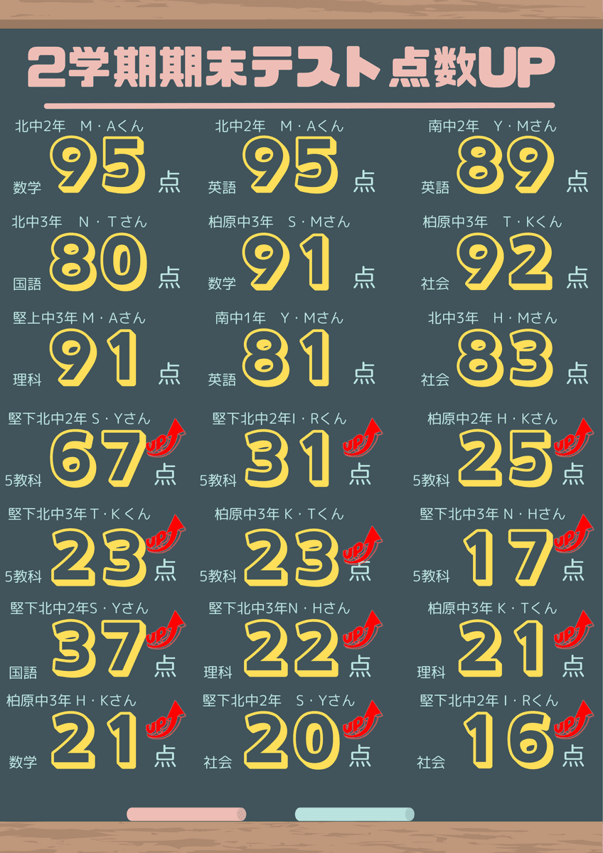 中学生から通っていて、中学の時も公立、私立とも志望校に合格できたし、高校になっても定期テストの点数も高くなって志望校に合格できた