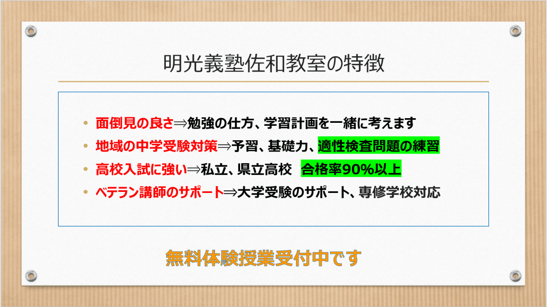 雰囲気がよく先生も勉強に熱心で励ましやモチベーションのあがる言葉をかけたくださる勉強への意欲があがる塾でした。