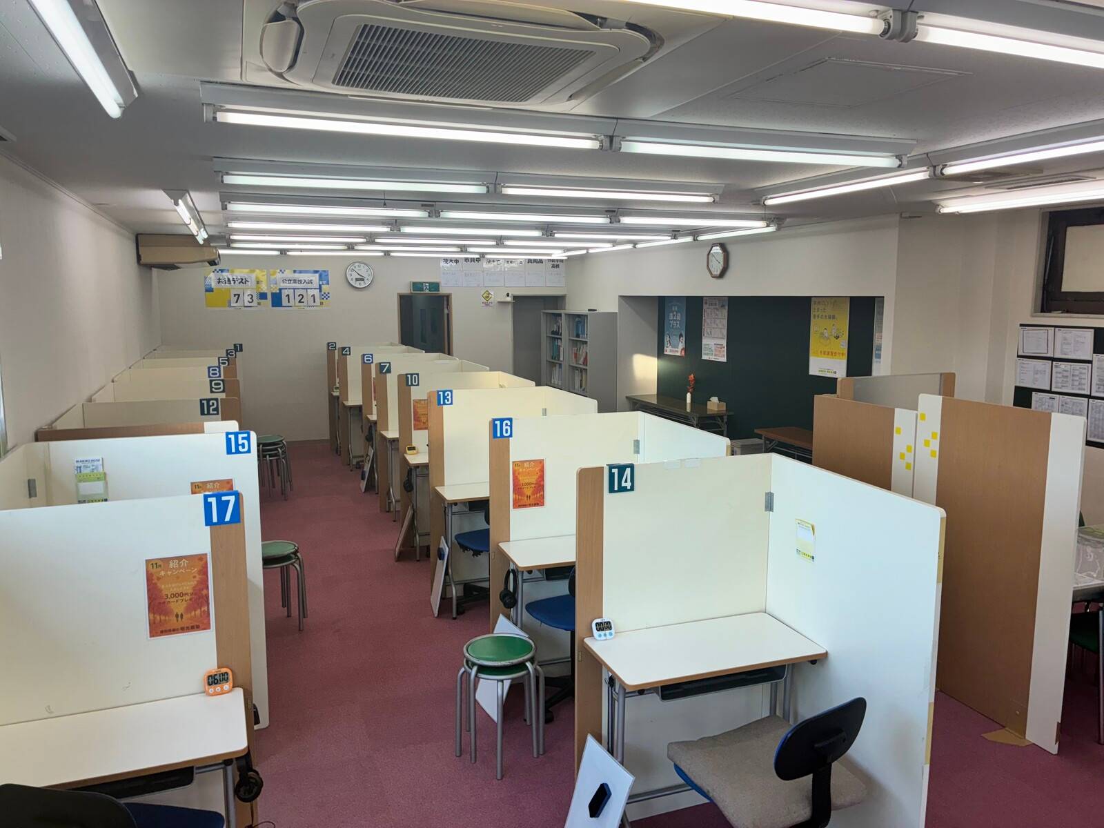 中学生などで、うるさかった人もいたし、自習室で、映像授業も受けていたが、自習室と、個別指導を受ける場所の間にドアや壁などの仕切りがなく、話声が漏れ聞こえてきたので、集中できないこともあった。